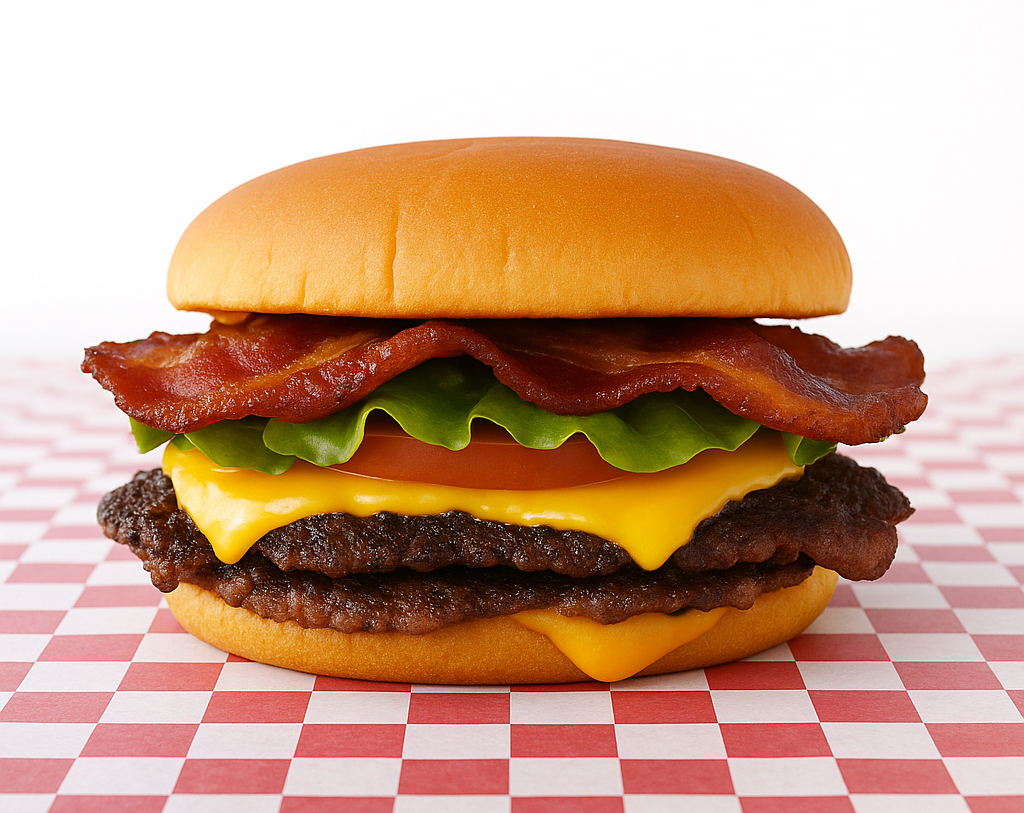 Double-Patty Smash Burger with Beef Bacon, American Cheese, Lettuce, Tomato, House Sauce