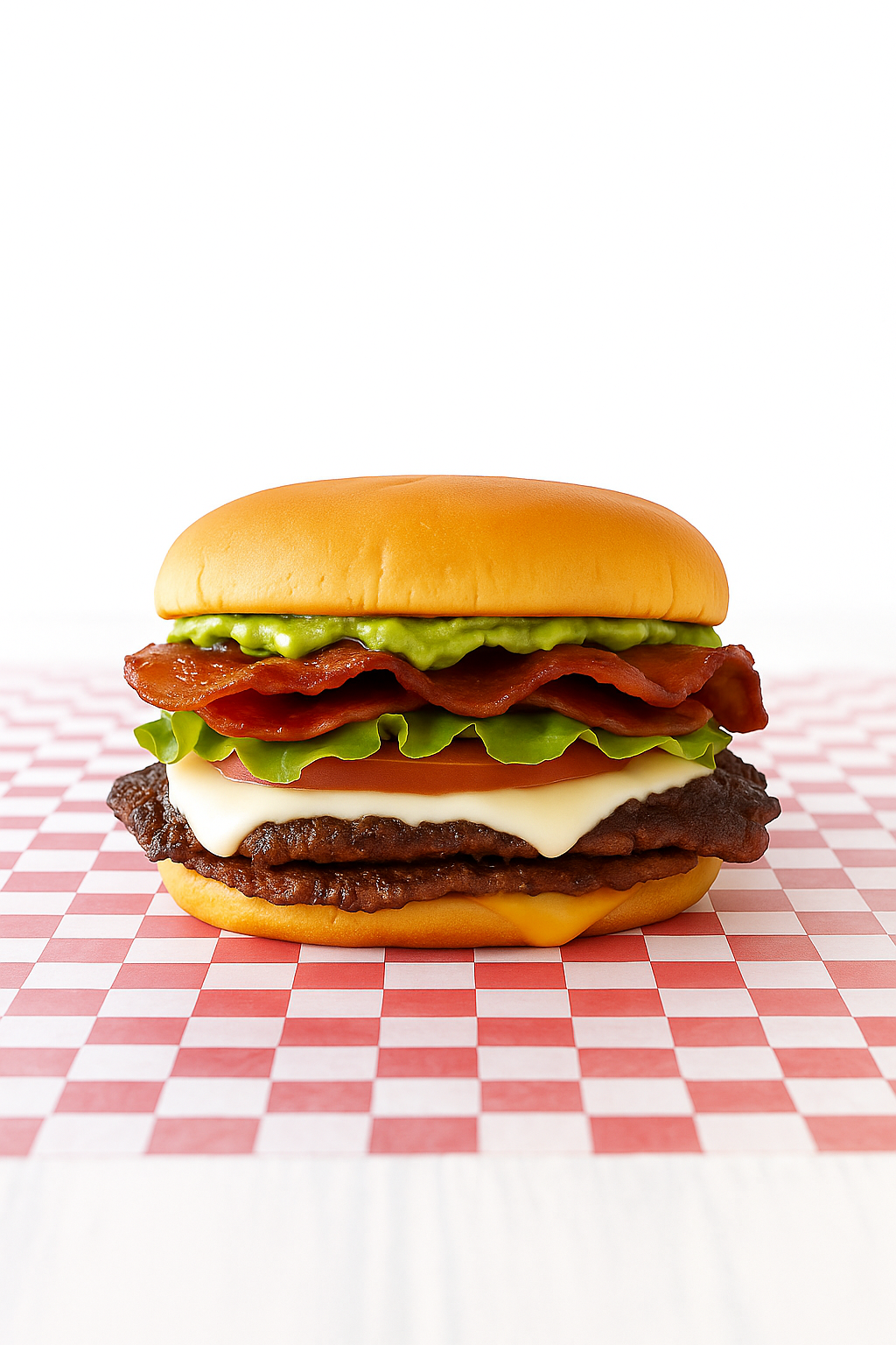 Double-Patty Smash Burger with Beef Bacon, Swiss Cheese, Lettuce, Tomato, Mild Chunky Guacamole, and House Sauce