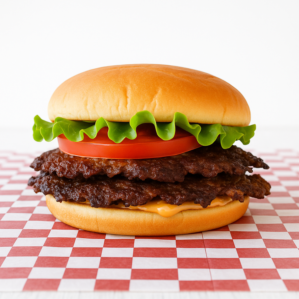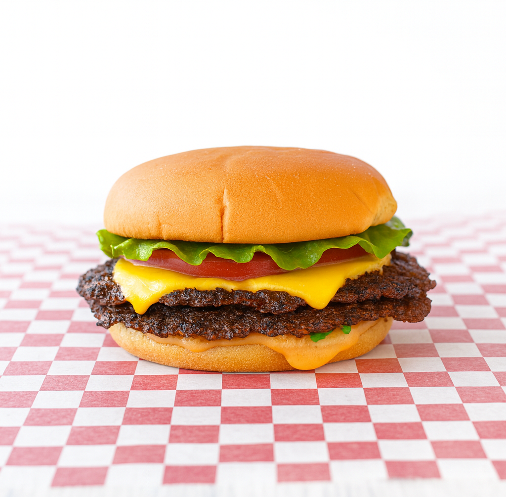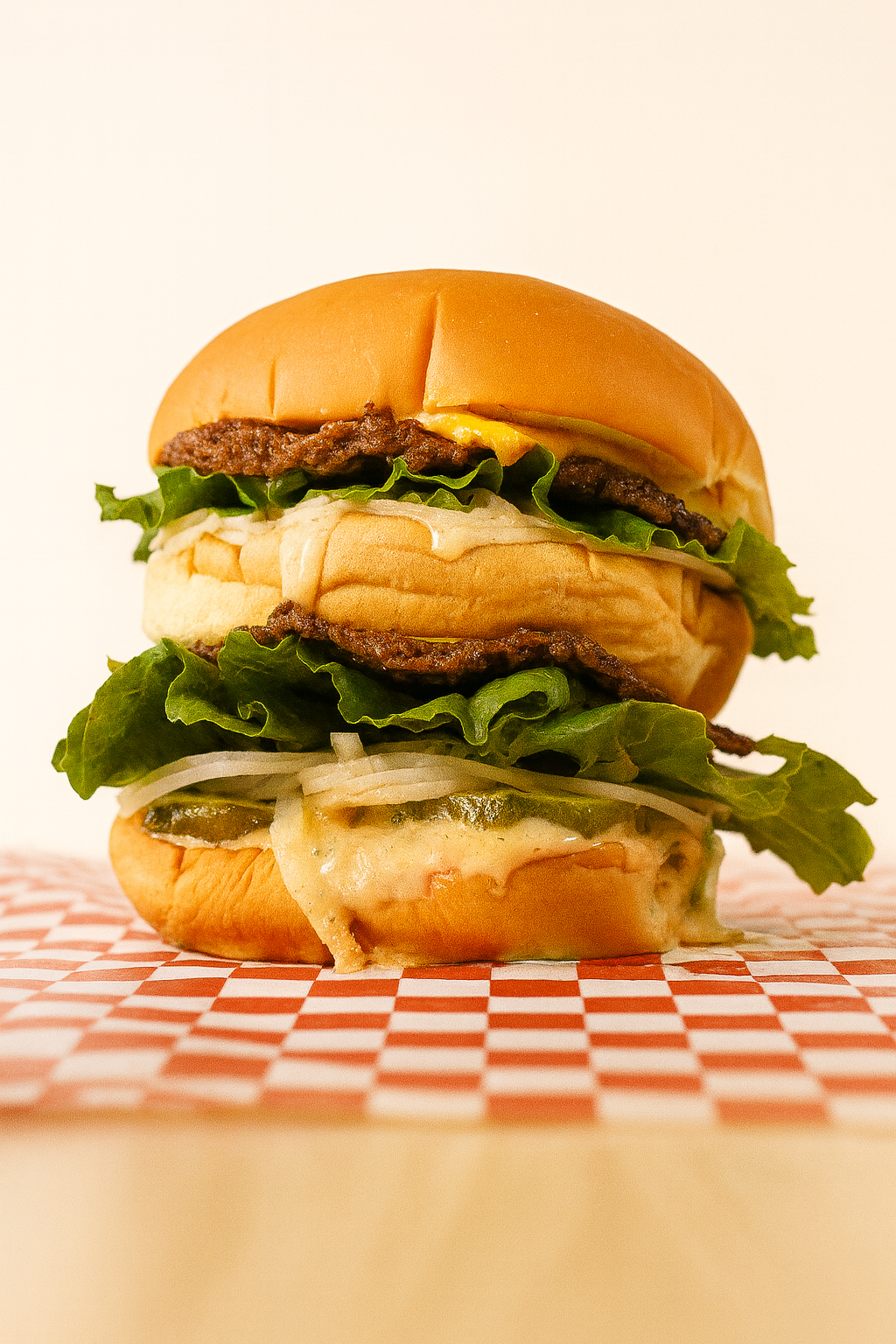 Double-Patty Smash Burger, Three-Part toasted Bun, Lightly Seasoned with American Cheese, Lettuce, Pickles, Onions, Tangy and Sweet Sauce