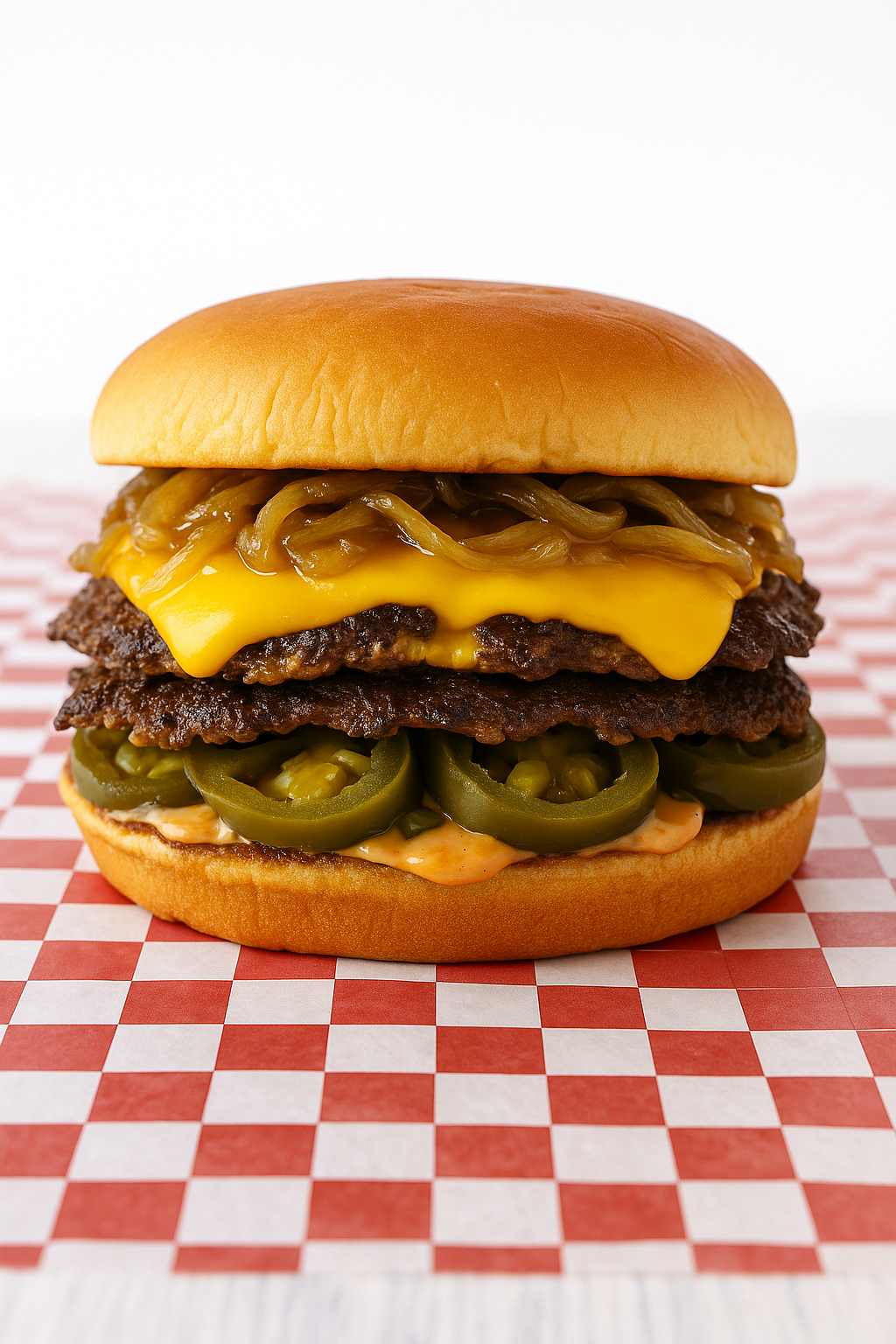 Double-Patty Smash Burger with American Cheese, Jalapeno Fried Onions, Pickles, House Sauce
