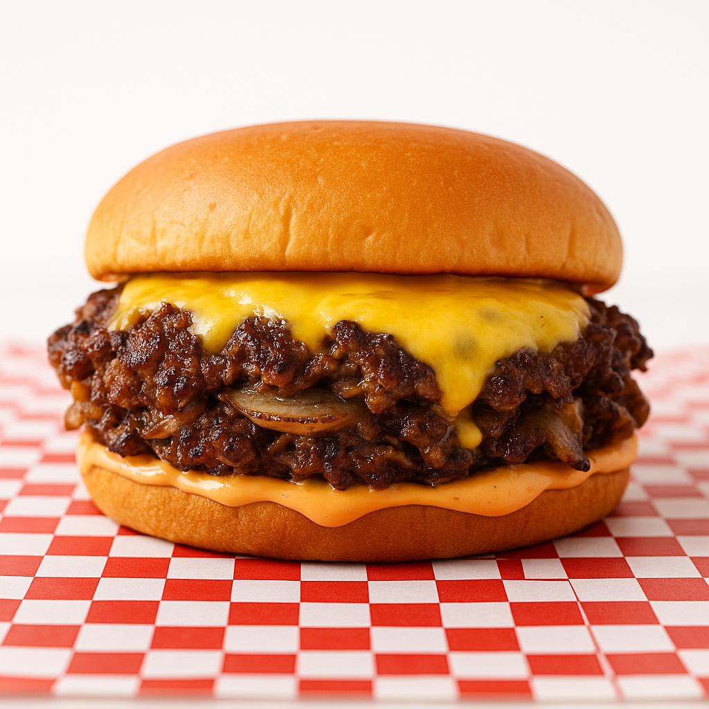 Double-Patty Smash Burger with Onions Smashed in, American Cheese, House Sauce