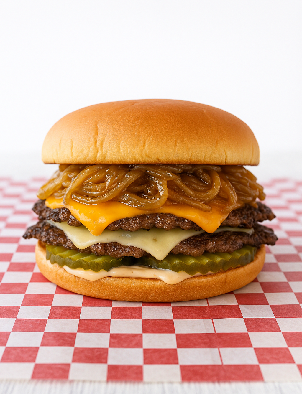 Double-Patty Smash Burger with Swiss and American Cheese, Fried Onions, Pickles, House Sauce