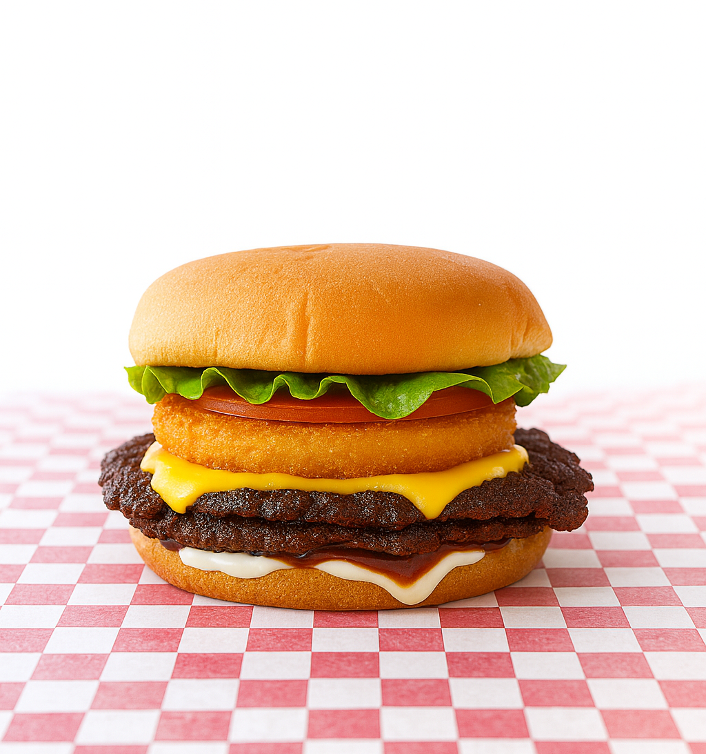 Double-Patty Smash Burger with American Cheese, Onion Ring, Lettuce, Tomato, Mayonnaise, Chipotle BBQ Sauce