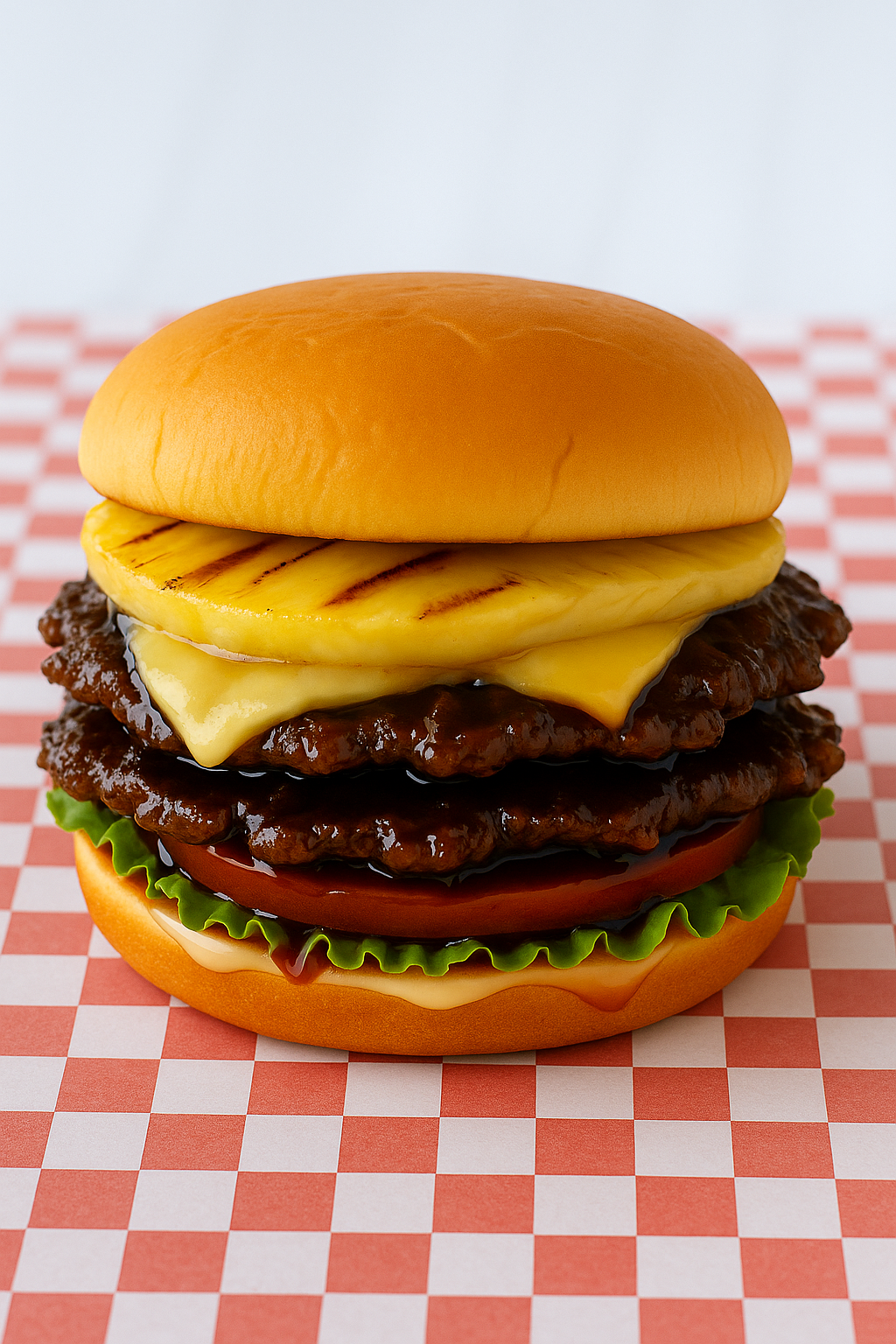 Double-Patty Smash Burger with Swiss Cheese, Grilled Pineapple Ring, Lettuce, Tomato, Mayonnaise, Teriyaki Sauce
