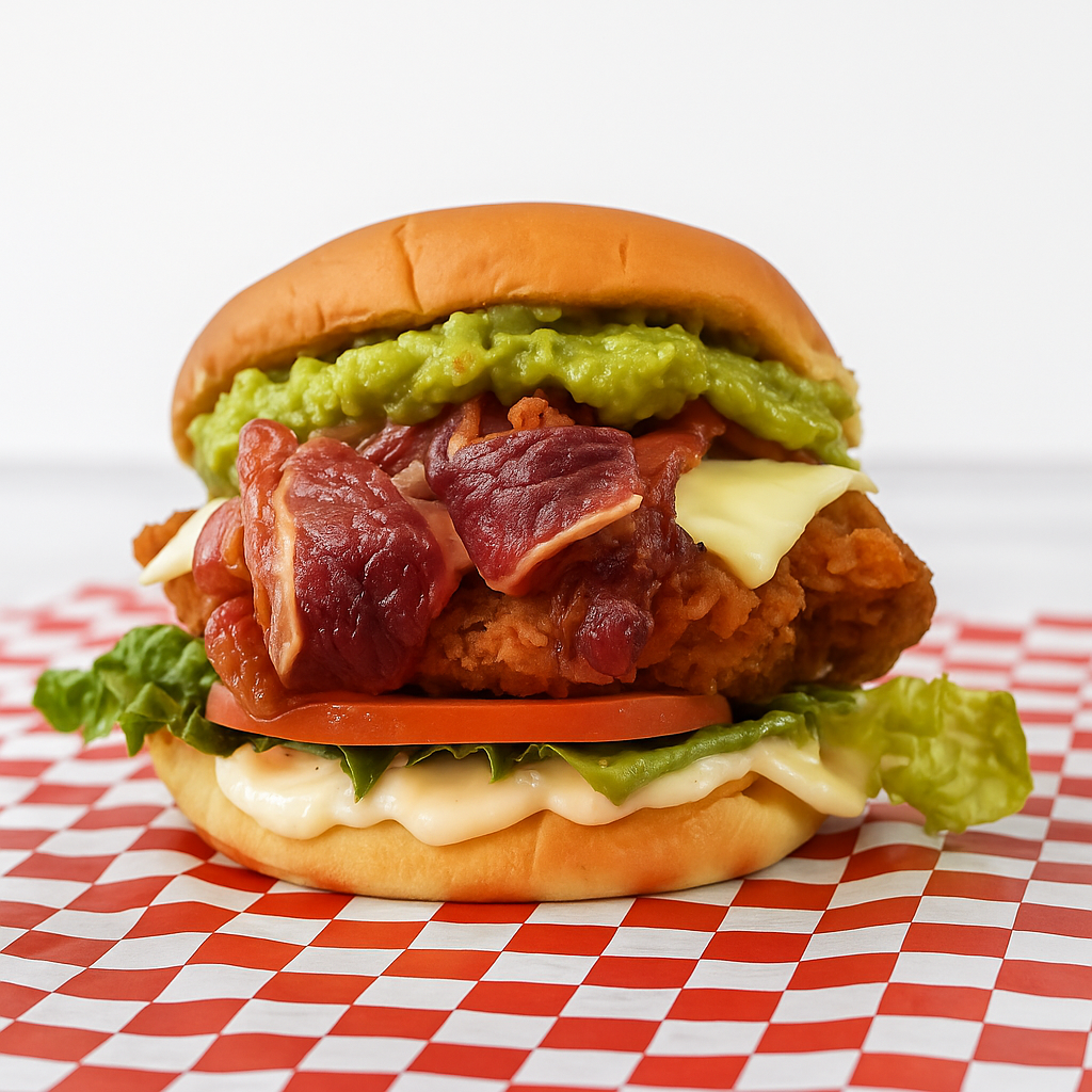 Crispy Chicken Breast with Guacamole, Beef Bacon, Swiss Cheese, Lettuce, Tomato, Mayonnaise