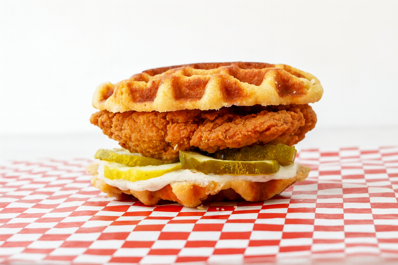 Crispy Chicken Breast between Two Maple-Belgian Waffles, Pickles, Buttermilk Ranch, Spicy House Sauce